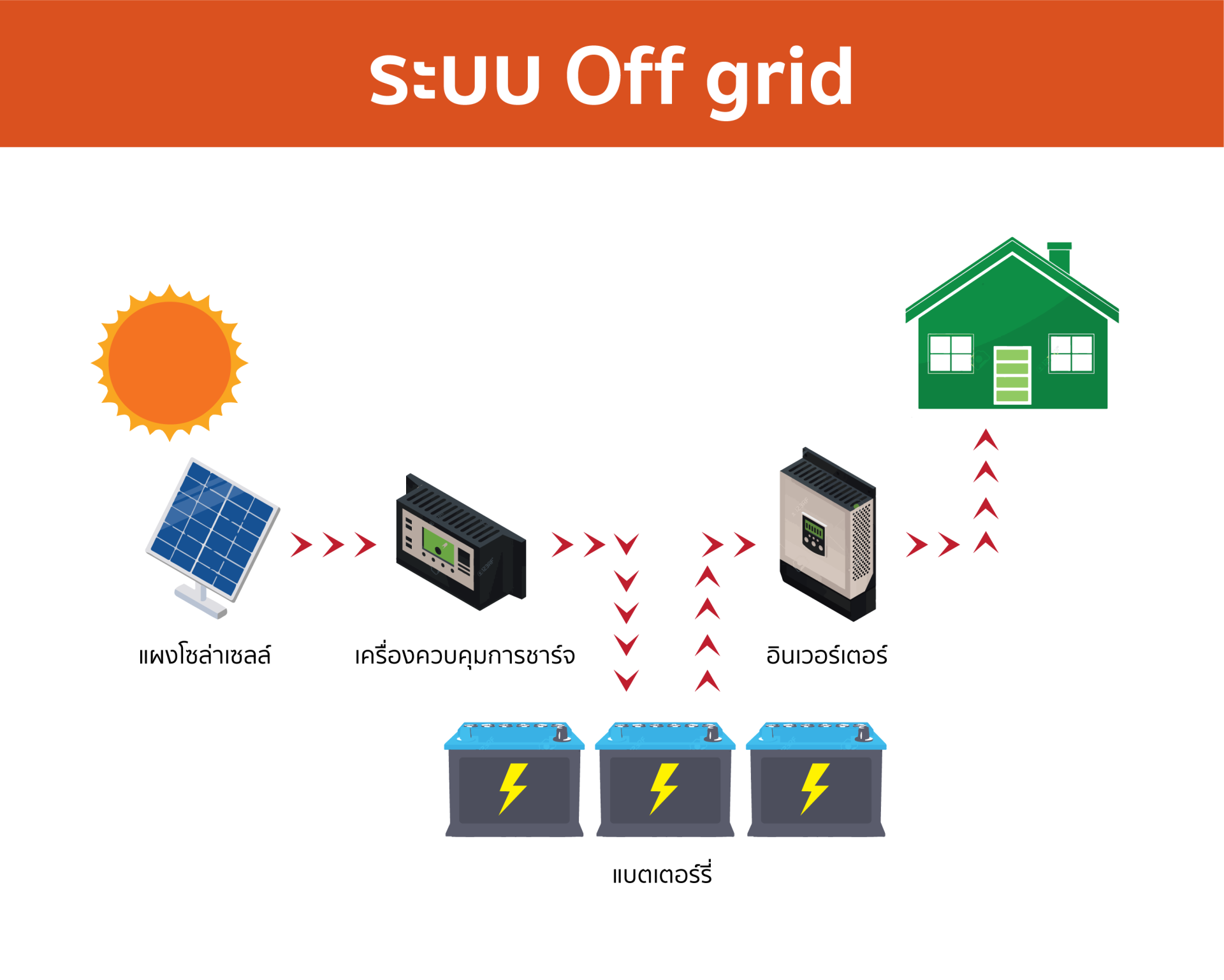 หลักการของระบบออฟกริด คือ ผู้ติดตั้งโซลาร์เซลล์จะสามารถผลิตไฟฟ้าใช้ได้เอง ซึ่งวิธีการต่อระบบจะมีหลายรูปแบบ ประกอบด้วย